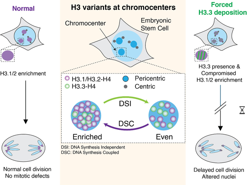 Figure : Représentation schématique de la dynamique des variants H3 au niveau des chromocentres. Au centre : Le dépôt des variants H3.1/2 et H3.3 aux chromocentres dans la chromatine des cellules souches embryonnaires est régulé par deux mécanismes de dépôt distincts, couplés à la synthèse de l'ADN (DSC) et indépendant de la synthèse de l'ADN (DSI), ce qui donne lieu à deux schémas principaux : enrichi en H3.1/2 et équilibré en H3.1/2-H3.3. À gauche : dans les cellules souches embryonnaires normales, l'enrichissement en H3.1/2 est produit par DSC et se maintient avant la division cellulaire. À droite : Forcer le dépôt de H3.3 par DSI conduit à une incorporation continue de H3.3, perturbant l'enrichissement physiologique de H3.1/2 aux chromocentres. Cette interférence entraîne des défauts de morphologie nucléaire et une altération de la progression du cycle cellulaire.