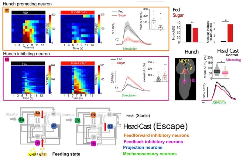 Figure : La modulation des neurones inhibiteurs réciproquement connectés du circuit de décision, par l’état alimentaire (ici en régime en sucre) biaisent les décisions sensorimotrices en réponse à un stimulus mécanique aversif vers moins de « Hunch » (type de réponse de sursaut) et plus de « Head Cast » (type de réponse de fuite). L’information sur le changement de l’état alimentaire est apportée au circuit de décision par les neuropeptides NPF (neuropeptide F) et short neuropeptides F), tous les deux homologues du neuropeptide Y chez les mammifères. De plus, les neurones descendants qui sécrètent le NPF sont connectés à l’un des neurones inhibiteurs.
