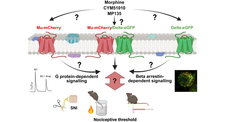 Les récepteurs opioïdes appartiennent à la famille des récepteurs couplés aux protéines G. Les récepteurs opioïdes μ et δ modulent les seuils de détection thermique et mécanique et sont largement distribués dans les circuits de la douleur. Lorsqu’ils sont co-exprimés dans un même neurone, ils peuvent interagir pour former une nouvelle entité appelée hétéromère μ–δ. Ces hétéromères présentent des propriétés spécifiques en termes de liaison des ligands, de signalisation cellulaire et de trafic intracellulaire.