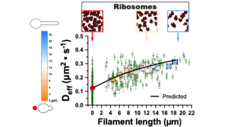 Figure : La diffusion des macromolécules (Deff) dans la cellule de C. albicans augmente avec l’extension du filament. Les symboles du graphe représentent des cellules individuelles (petits carrés) ou des groupes de cellules (grands cercles), les couleurs correspondent aux longueurs de filament. Les images au-dessus du graphe montrent l'encombrement des ribosomes, qui diminue à mesure que le filament s'allonge.