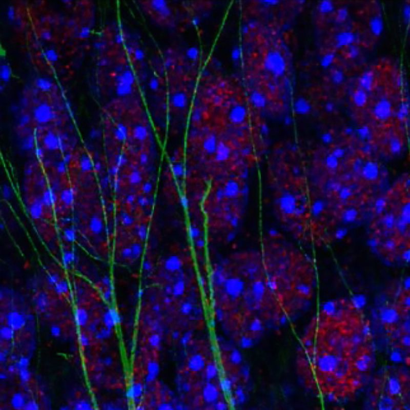 Figure 1 : Sur cette image, on peut observer une sous-population de neurones appelés « cellules granulaires » dans la région du gyrus denté de l’hippocampe (structure cérébrale) d’un modèle murin contrôle non infecté par T. gondii. Les noyaux cellulaires sont marqués en bleu, les projections astrocytaires en vert, et les cassures double-brin de l’ADN en rouge (lorsque le marquage est agrégé, ce qui n’est pas le cas dans cette image de condition contrôle).