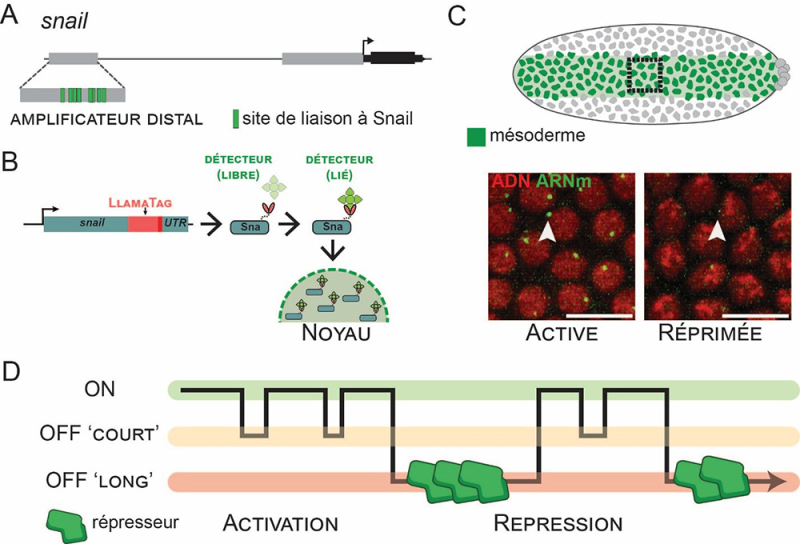 D - Schéma des dynamiques de transcription active (à gauche) et réprimée (à droite). L’état inactif « OFF long » nécessite l’action coopérative de multiples protéines répresseurs Snail (en vert) pour maintenir un silence transcriptionnel durant plusieurs minutes.