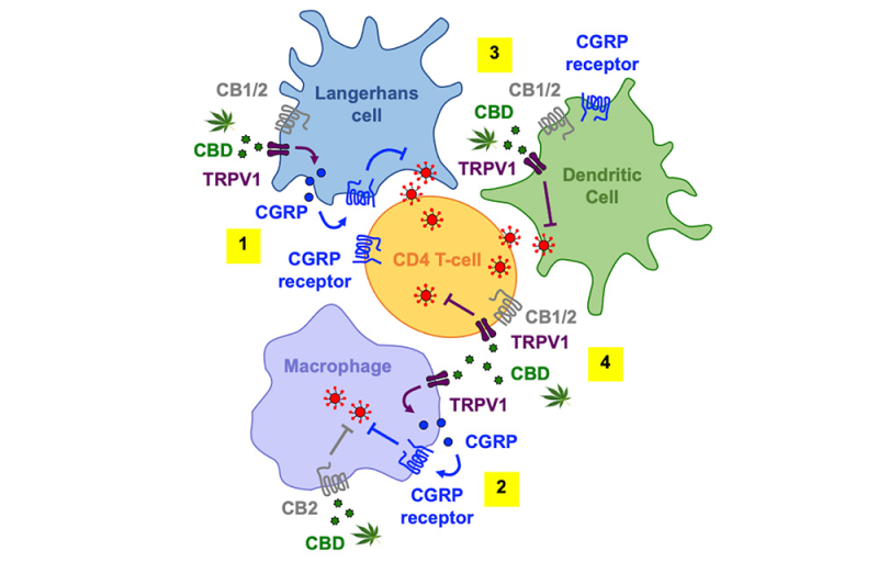 Dans cette nouvelle étude publiée dans la revue Mucosal Immunology, les scientifiques ont exploré l’effet du CBD sur plusieurs cellules cibles du VIH-1 : cellules de Langerhans, cellules dendritiques, macrophages et lymphocytes T CD4.