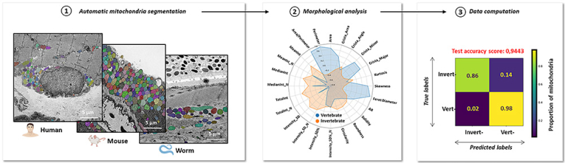 Figure : L’algorithme d’IA est capable de détecter précisément les mitochondries (en couleurs) à partir de tissus provenant de différentes espèces imagées en ME (à gauche). Pour chaque mitochondrie segmentée, l’outil extrait 26 métriques de morphologie et d’ultrastructure qui peuvent être affichées à l’aide de graphiques. Le radar plot (au milieu) illustre des différences éloquentes de métriques entre les vertébrés et les invertébrés. À partir de ces métriques, le réseau de neurones est capable de prédire avec une précision de 94 % la classe d’appartenance de chaque mitochondrie (à droite).