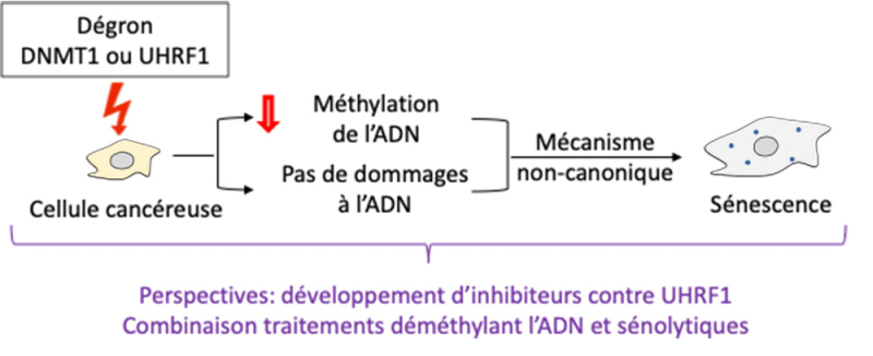 Figure: Le travail effectué sur cellules cancéreuses permet de séparer déméthylation de l'ADN et dommages à l'ADN. Il montre que la déméthylation de l'ADN, en elle-même, provoque la sénescence des cellules cancéreuses par un mécanisme non-canonique. Il établit l'intérêt de rechercher des inhibiteurs de UHRF1, et montre l'intérêt potentiel de coupler traitement déméthylant et traitement sénolytique. Résumé des résultats publiés par Chen et al.