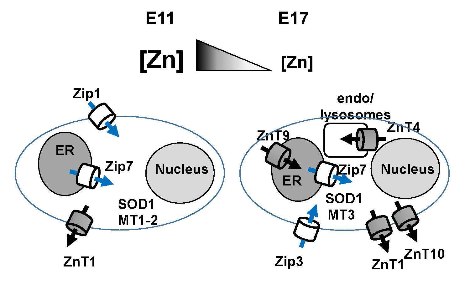 Par ailleurs, des expériences réalisées sur le synchrotron européen de Grenoble (ESRF) ont permis de quantifier et de cartographier la distribution spatiale du Zn dans des neurones par fluorescence X. Ces analyses ont été réalisées à différents stades embryonnaires afin d’avoir des informations sur le décours temporel des processus étudiés. Il apparait qu’au cours de la formation du cortex cérébral il y a une diminution de la teneur en Zn associée à une importante régulation de l’expression de transporteurs à Zn notamment ZIP7, situé dans le réticulum endoplasmique, ZnT1 et ZnT10, deux transporteurs de la surface cellulaire contribuant à l’efflux du Zn hors des cellules.