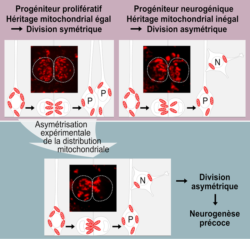 Figure : Lors des stades précoces de développement du tube neural de l'embryon de poulet, les progéniteurs s'amplifient par des divisions symétriques donnant naissance à deux progéniteurs. La ségrégation mitochondriale au cours de la mitose est égale (haut, gauche). Au cours de la neurogenèse, la transition vers un mode de division asymétrique produisant un neurone et un progéniteur est marquée par l'apparition d'une ségrégation inégale des mitochondries, la cellule fille en héritant le moins se différenciant (haut, droite). Forcer cette ségrégation inégale, en modifiant le transport de ces organelles au cours de la mitose, lorsque les divisions symétriques prédominent est suffisant pour induire un destin différentiel des cellules filles et une neurogenèse prématurée (bas). Les encarts montrent les mitochondries (en rouge) héritées par chacune des cellules sœurs dont le contour est marqué par une ligne pointillée.