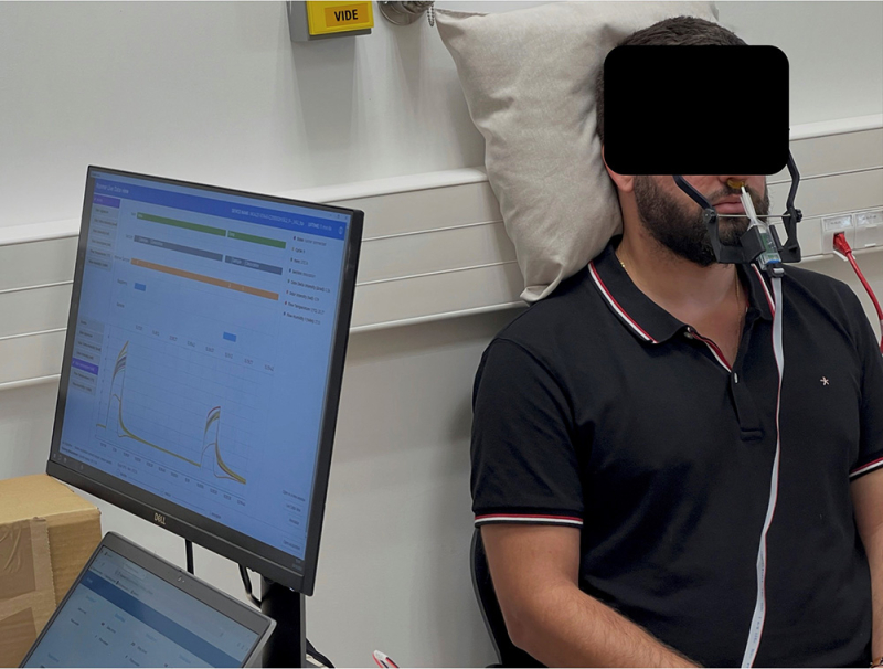 Figure : Sujet équipé d’un stimulateur intranasal testant une voie de substitution de l’odorat, tandis que l’expérimentateur contrôle la stimulation depuis l’ordinateur.